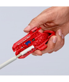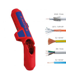 - Pour le dégainage et le dénudage rapide et précis de tous types de câbles ronds et hydrofuges standards (par ex., câble NYM 3 x 1,5 mm² jusqu‘à 5 x 2,5 mm²), câbles de données (par ex. paires torsadées) et câbles coaxiaux